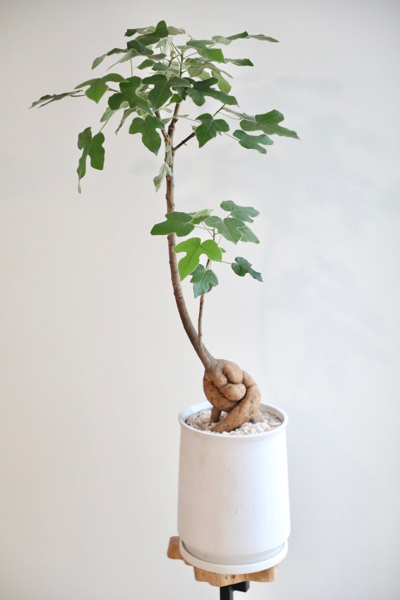 乾燥地帯で生き抜くため、幹の根本にぷっくりと水を貯めた愛らしい姿から「ボトルツリー」と呼ばれる品種。童話の星の王子さまでも知られるバオバブの仲間です。産毛の生えた独特な柔らかい葉形がクセになります。