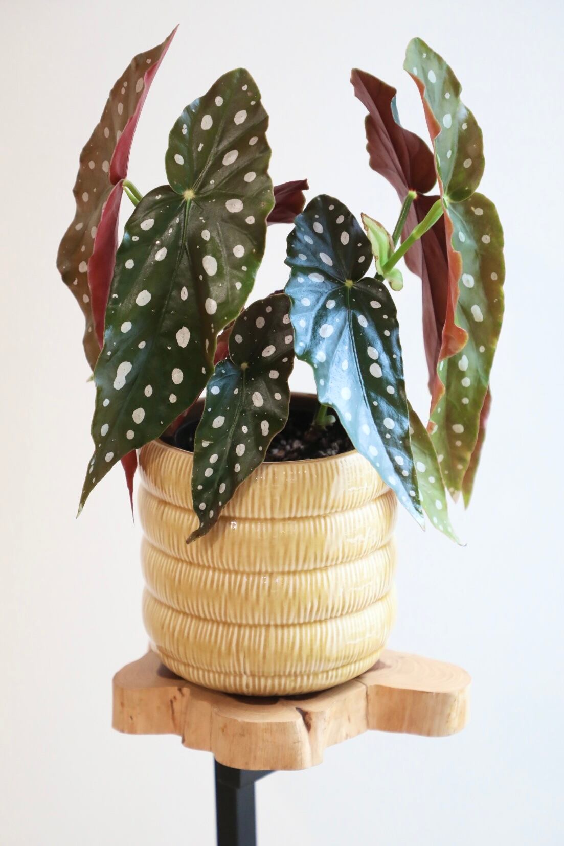 自然とは思えない独特な模様が魅力のベゴニアの仲間。輝くドットと、赤い葉裏、マクラータならではのこのカラーリング、インテリアにスパイスを入れるなら打ってつけ。