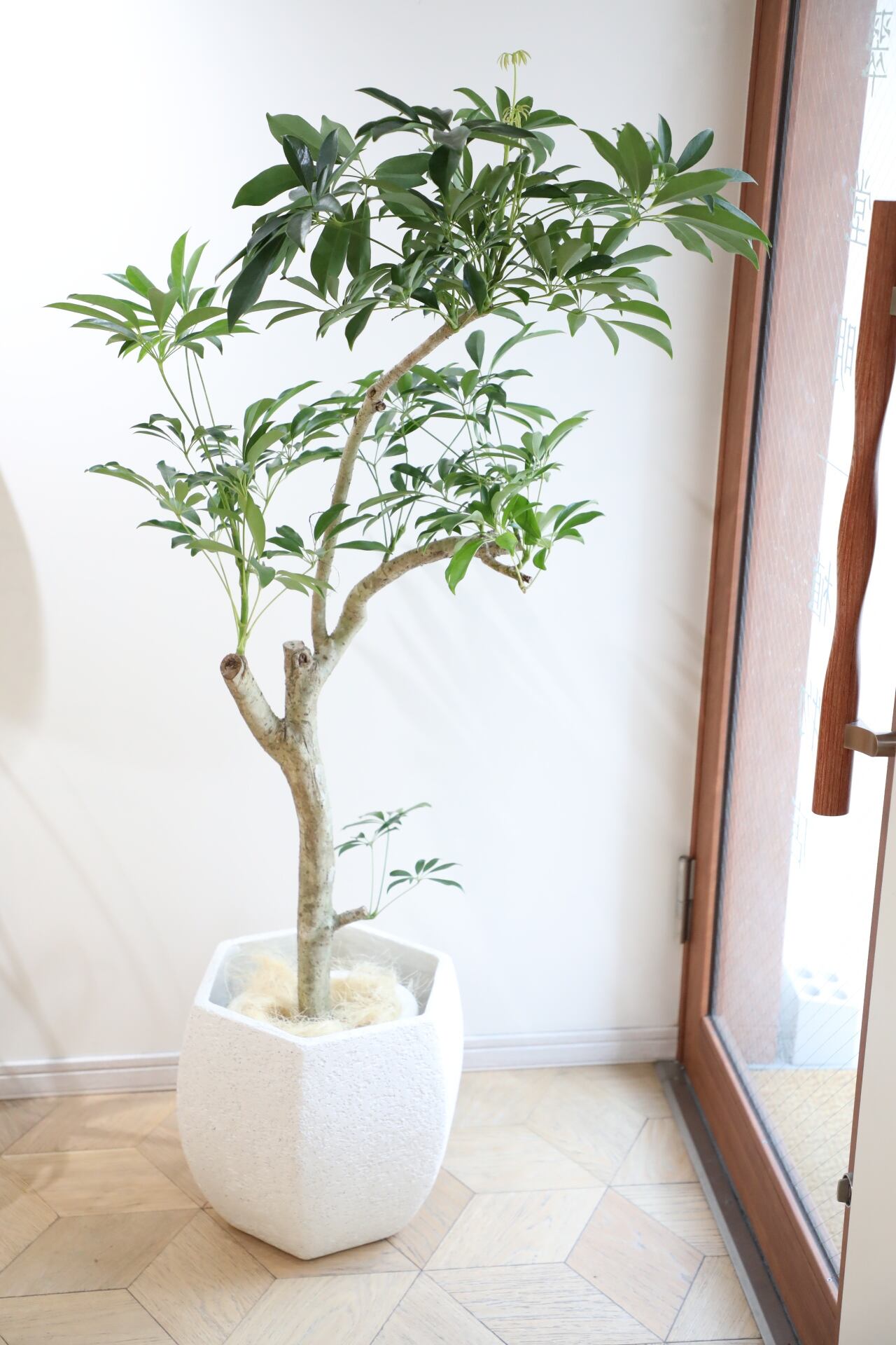 手の平をひろげたようなもっちりとした葉が可愛らしく、青々としたスタイリッシュなシェフレラです。長い歴史を刻んでいることが幹から伝わってきます。置くだけでパワーをもらえそうな美しい樹形です。