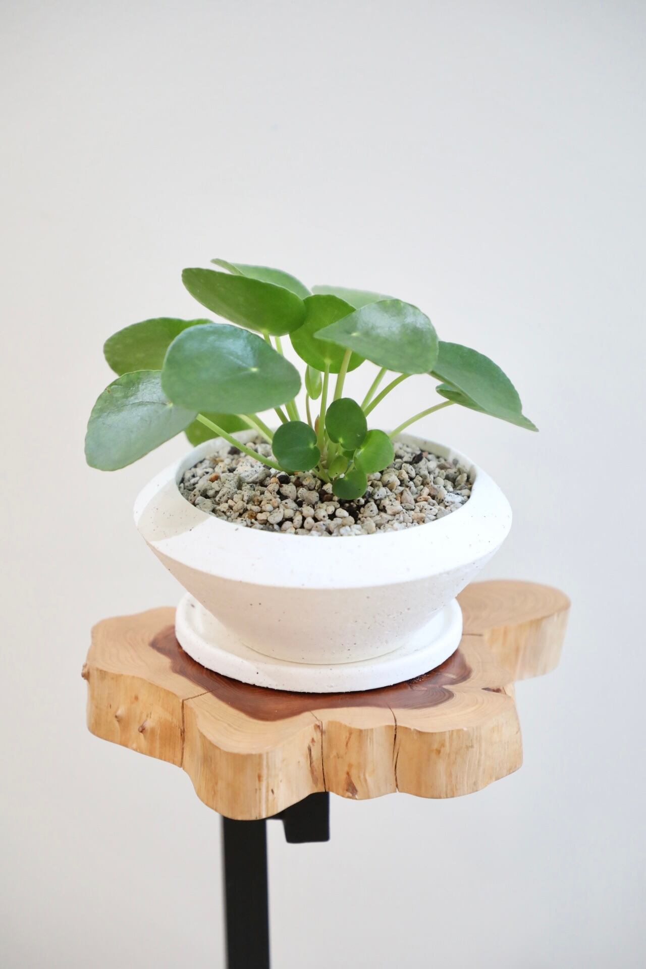 肉厚で光沢のある葉は可愛らしく、四方八方に伸びる丸い葉はアート感たっぷり。次はどの方向に新芽が伸びていくだろう?とお楽しみいただけます。