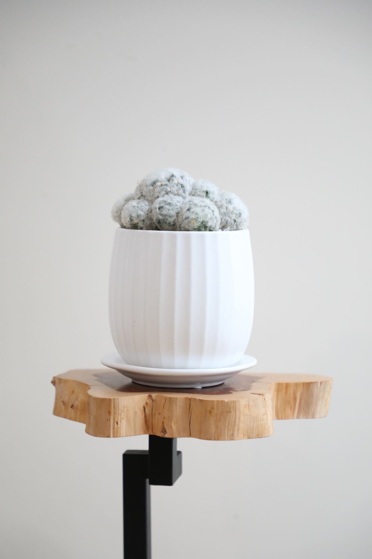 羽毛白星(ウモウシロボシ)と呼ばれるように、白い毛で覆われた姿とピンクの花が幻想的なマミラミア属のサボテン。アイスクリームのようなまんまるの集合がなんとも可愛らしいです。