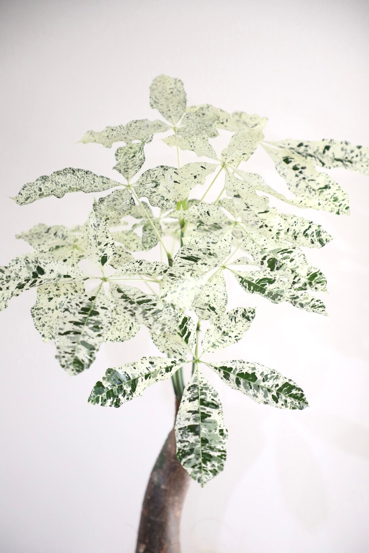 悪い気を吸収したり、金運アップの木と呼ばれたりと、風水的にもとても人気の高いパキラの美しい斑入り品種です。一枚一枚表情の違う葉模様は芸術的。お部屋を彩る一品です。幹二本仕立ての美しい曲線にうっとりします。