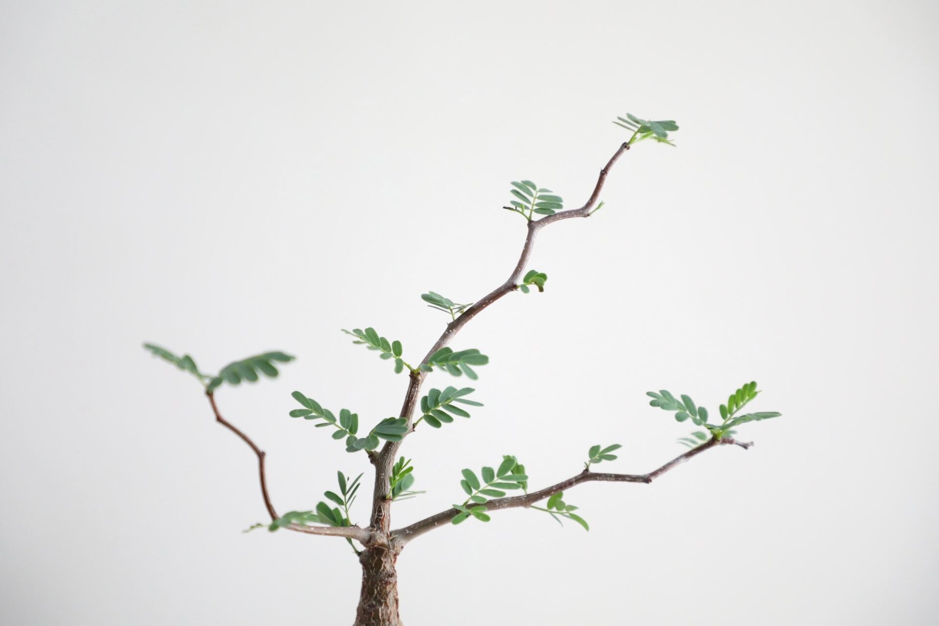 エバーフレッシュと同じマメ科の植物で、夜になると葉を閉じて休眠する性質があります。しかし、成長してくると逞しい幹となり、繊細さとはまた別の魅力も垣間見れます。
