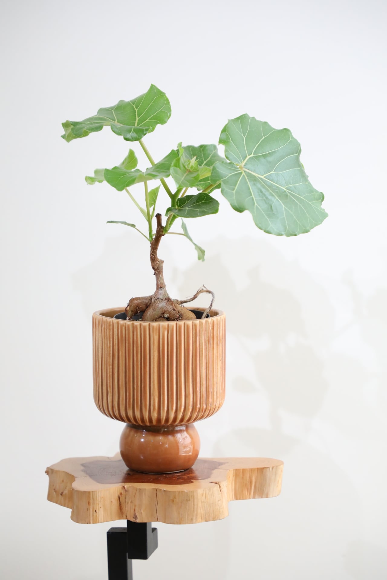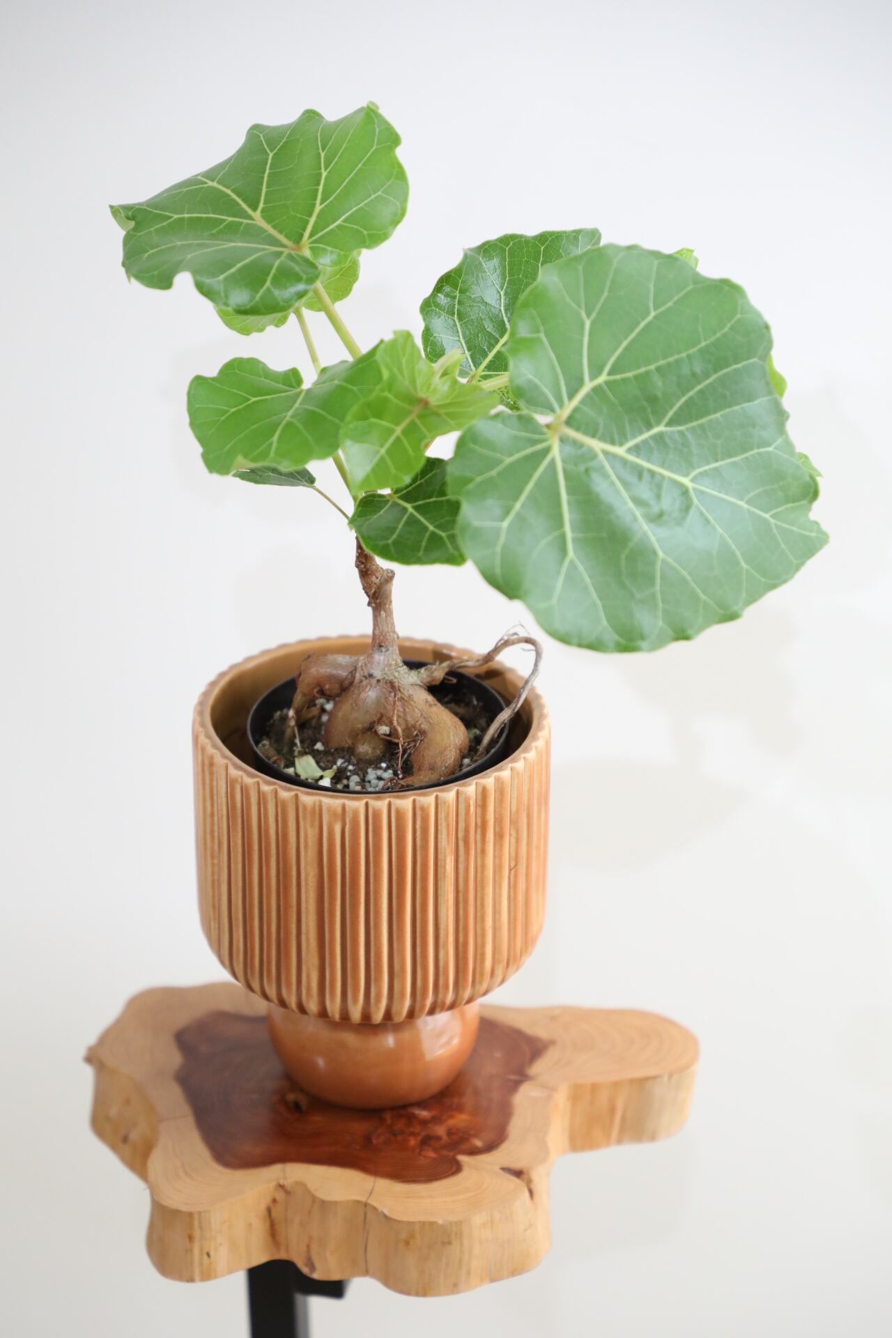 ハート型のパリッとした葉が可愛いです。フィカスでは珍しい塊根部が成長していく姿も楽しめます。しっかりと日光に当てることでギュッとしまり、大きな新芽に出会えたりします。あなた好みに育ててください。