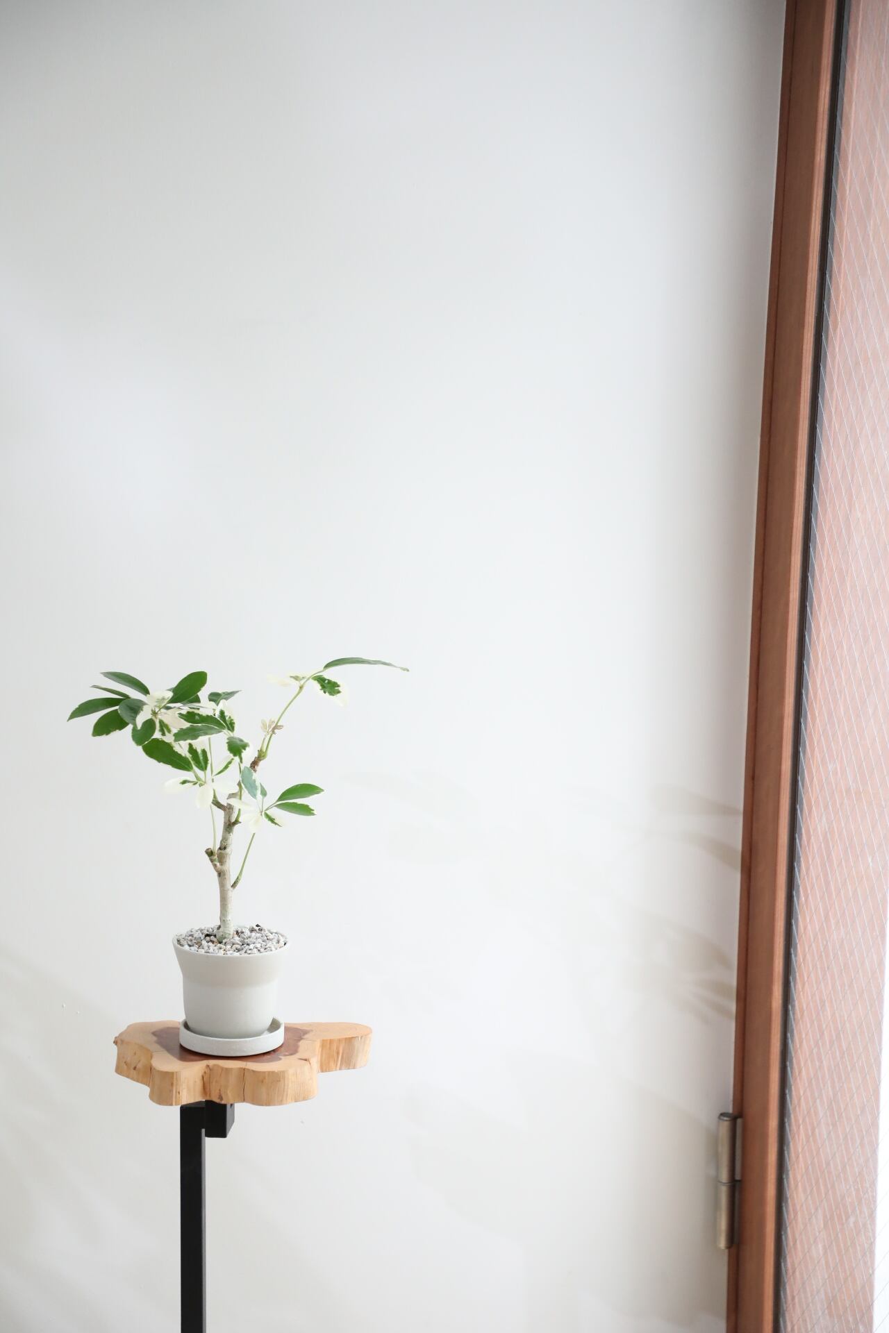 手の平をひろげたようなもっちりとした葉が可愛らしいシェフレラの、白い斑入り品種。一つ一つ班の入り方が異なるため、成長と共に様々な表情を楽しめるのも魅力です。