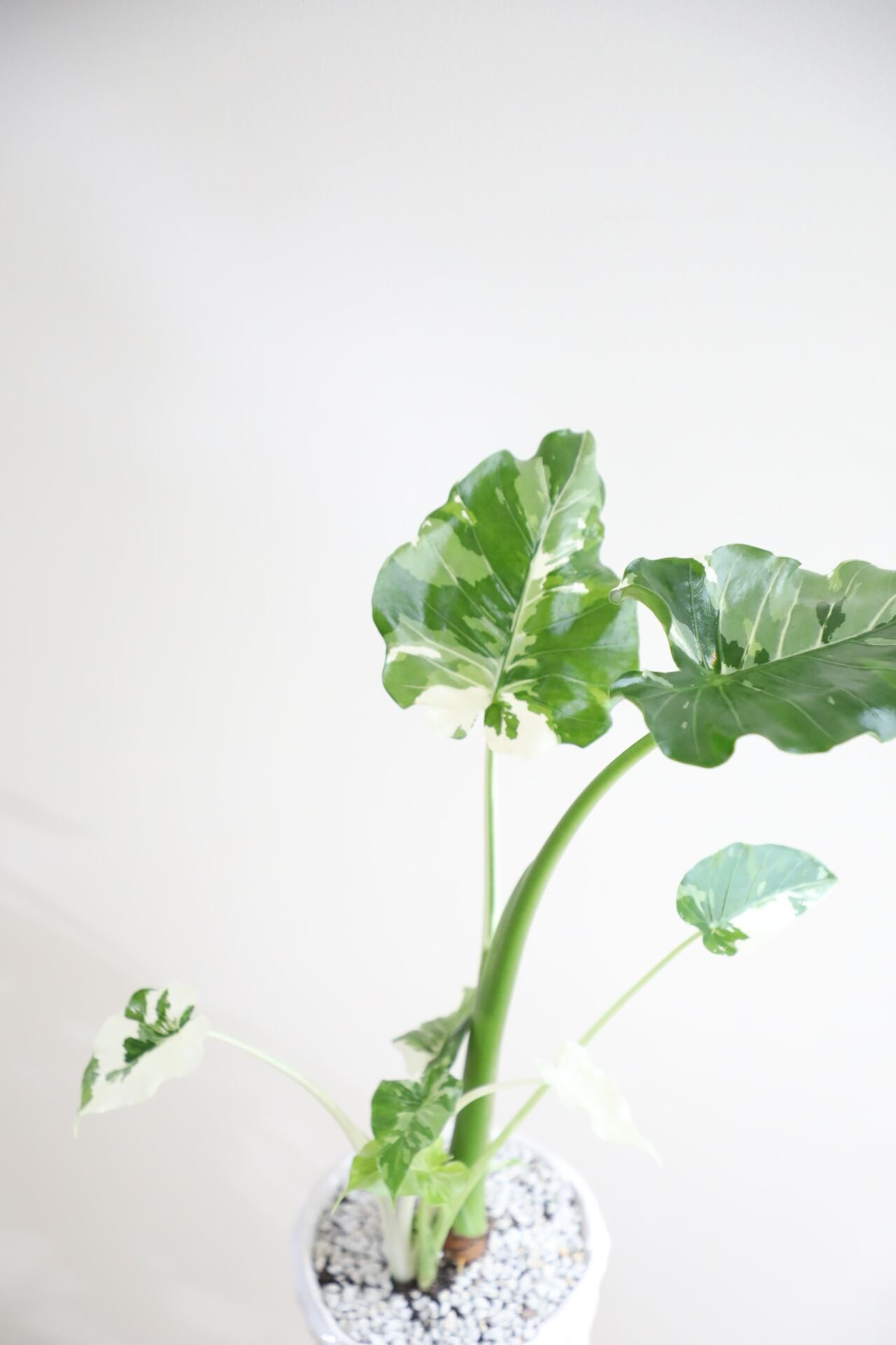 力強くしなやかにのびるインドクワズイモの斑入り品種。美しい葉模様とシルエットに魅了されます。毎朝眺めると気持ちがすっきりしそうなフォルムがたまりません。