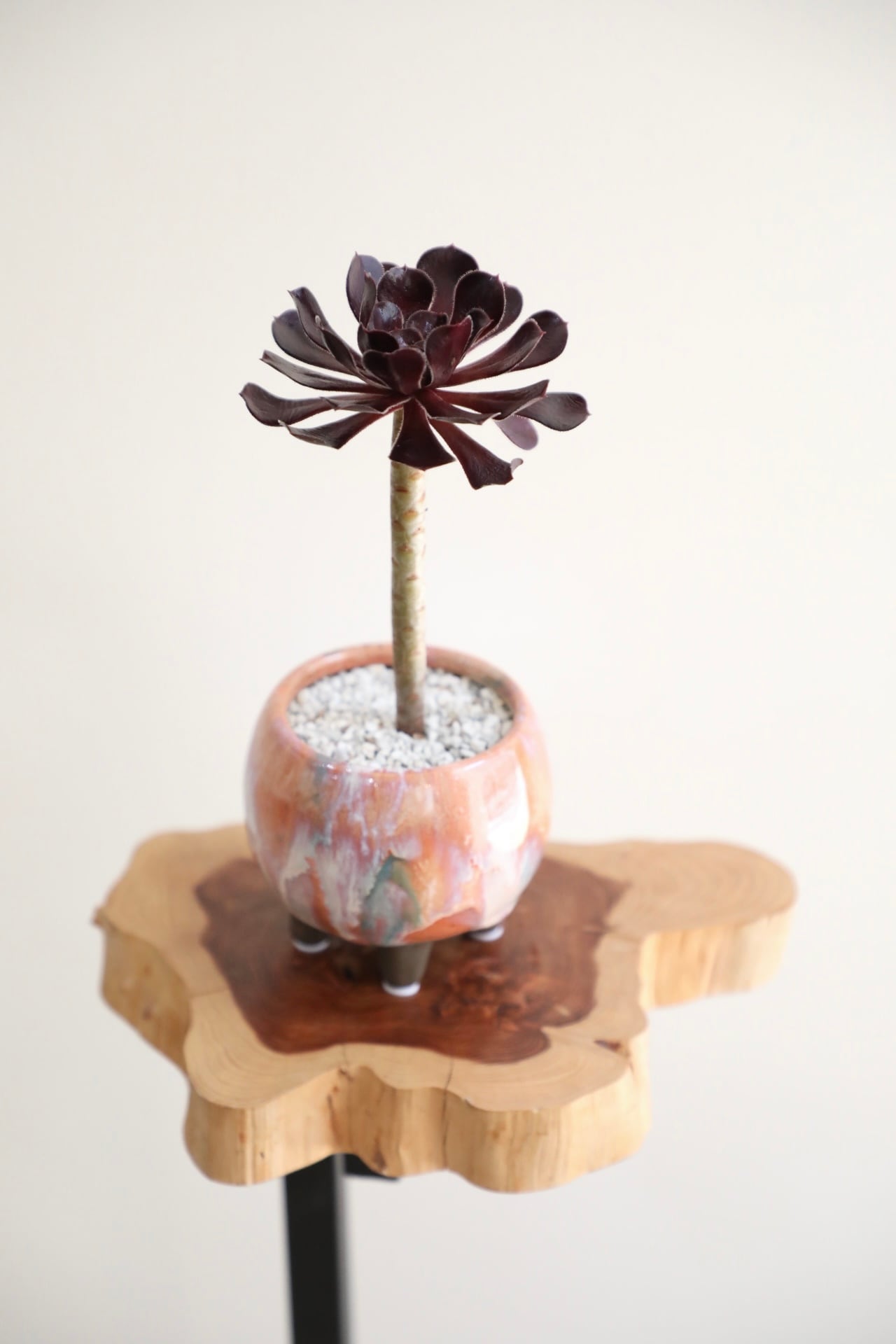 ロゼッタ状に茂る黒紫の葉は美しく、眺めているだけで気分が上がります。ハリと艶のある葉は日光をしっかり浴びせると美しく黒く発色をします。