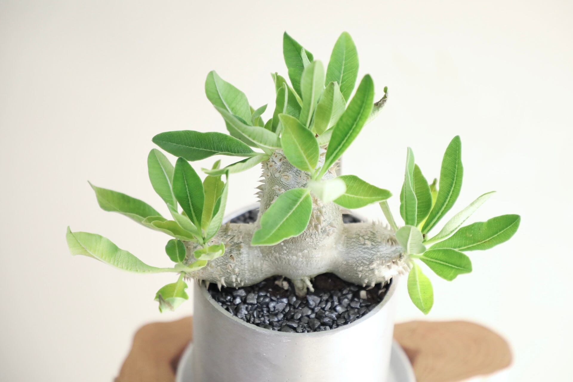 マダガスカルの岩場や平原に自生。パキポディウムデンシフローラムと恵比寿笑いの交配品種です。見た目とは裏腹に、春には黄色の花を咲かせてくれます。悪いものから守ってくれそうな力強いトゲに安心感を感じます。