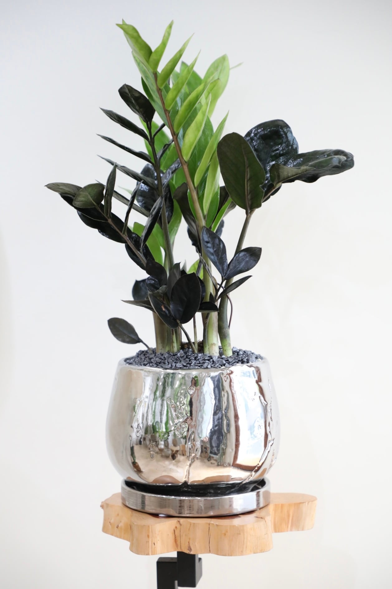 黒い中に深い緑を感じる艶のある葉は、存在感抜群。世界で注目されるザミオクルカスの園芸品種です。圧倒的な個性を放ち、インテリアを格上げします。緑色の新芽から成長と共に黒へと染まっていく様子をお楽しみいただけます。