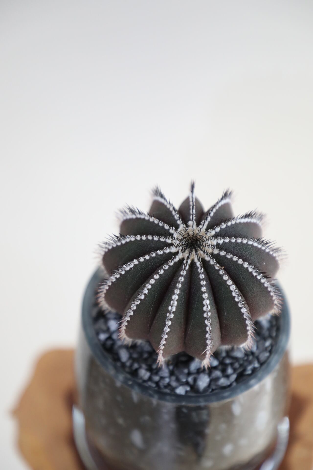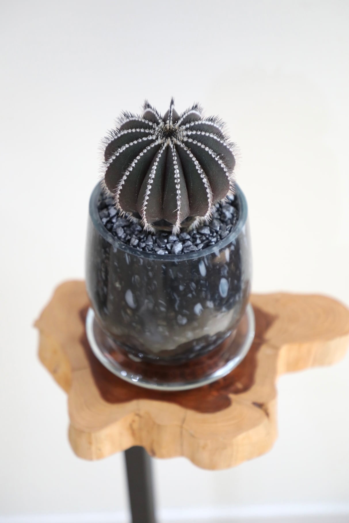 神々しさを感じる黒い肌が、ただならぬ存在感を出しています。成長と共に風船のようにフワッと膨らんだようなフォルムが可愛らしくもあり、たくましくもある不思議なサボテン。これからどんな風に膨らんでいくか楽しみです。