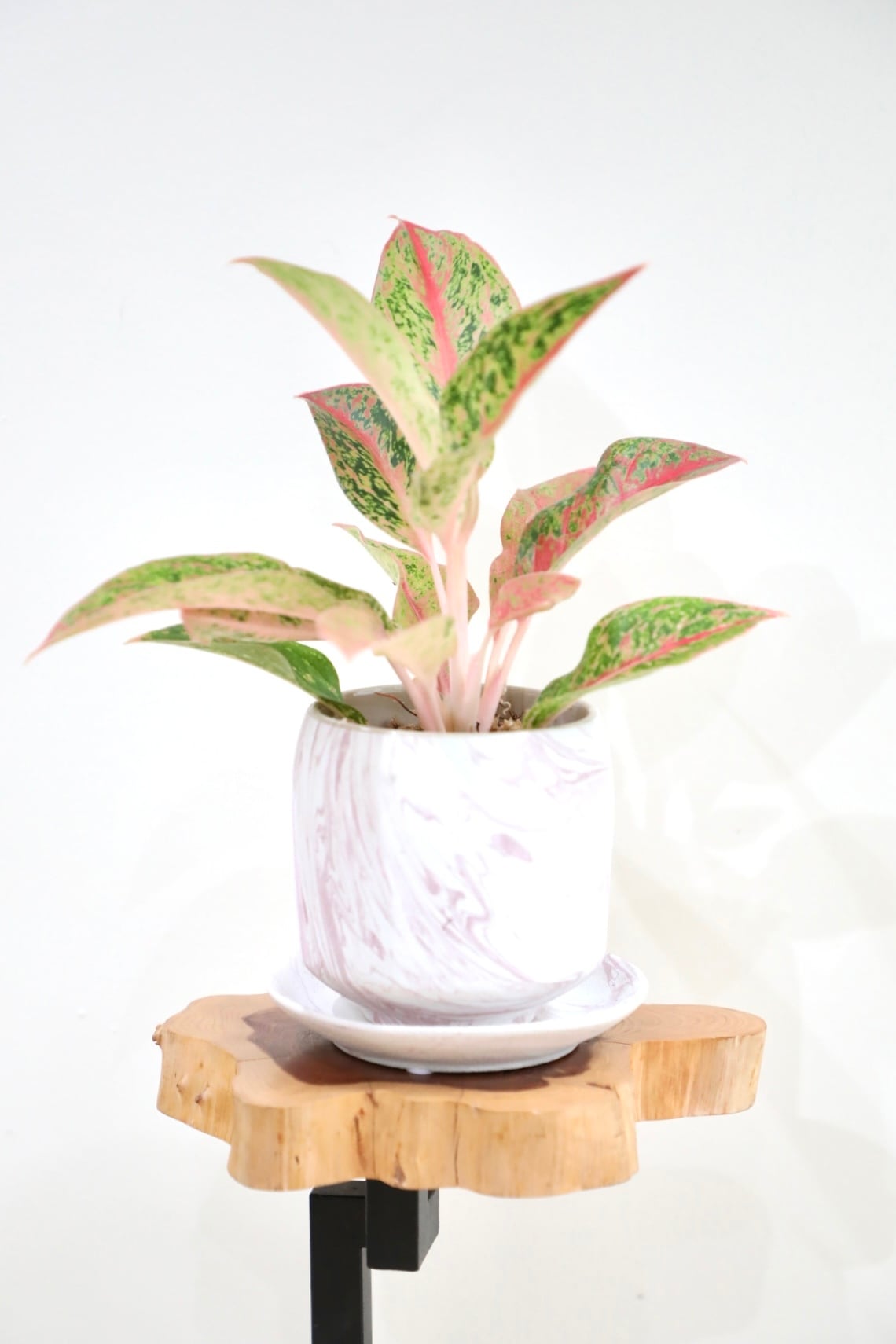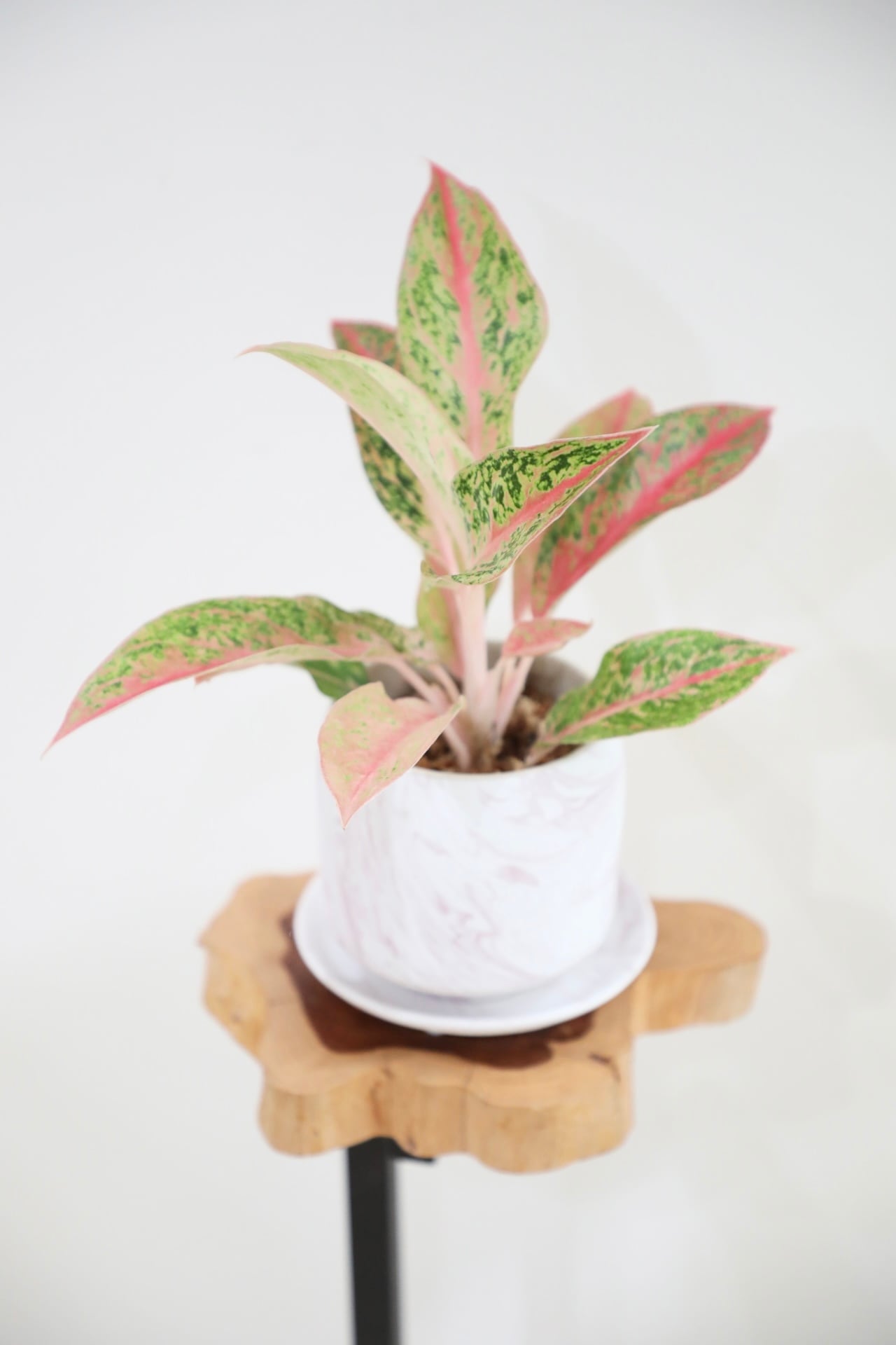 淡いピンクとビビットなピンクが絶妙に混ざり合う葉模様に惹き込まれます。滅多にお目にかかれないアグラオネマのピンク種です。