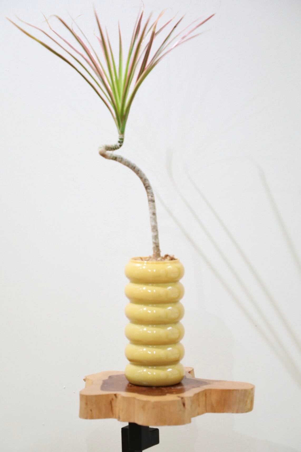緑と赤のストライプが美しく、繊細さとカラーリングの存在感がアーティスティックな空間を演出します。美しい曲げ木のシルエットがまたインテリア性を高めます。土を使わない水苔仕立てになっておりますので水やり頻度が少なく管理しやすいです。