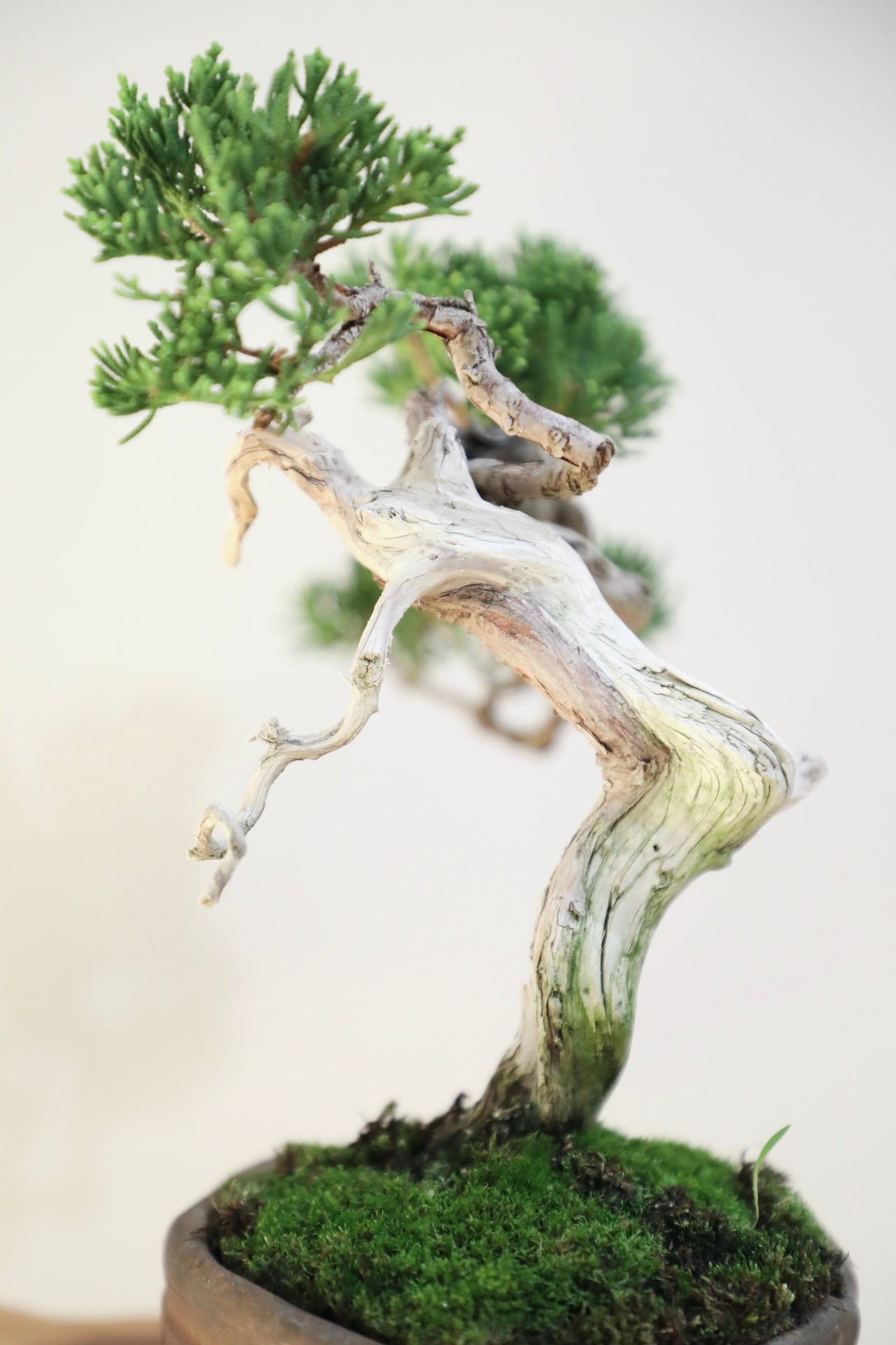 一本の木に生と死が共存している真柏。その中でも険しい岩山に自生する「糸魚川真柏」の長い年月をかけて育った幹や枝は非常に硬く力強く美しいです。枯れた白い幹と生きた幹のコントラスト、短く細かく分かれる繊細な葉をお楽しみください。