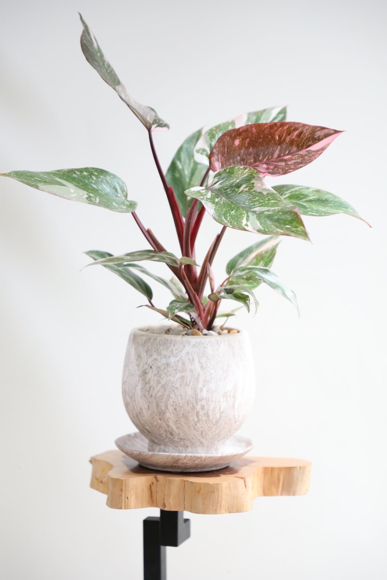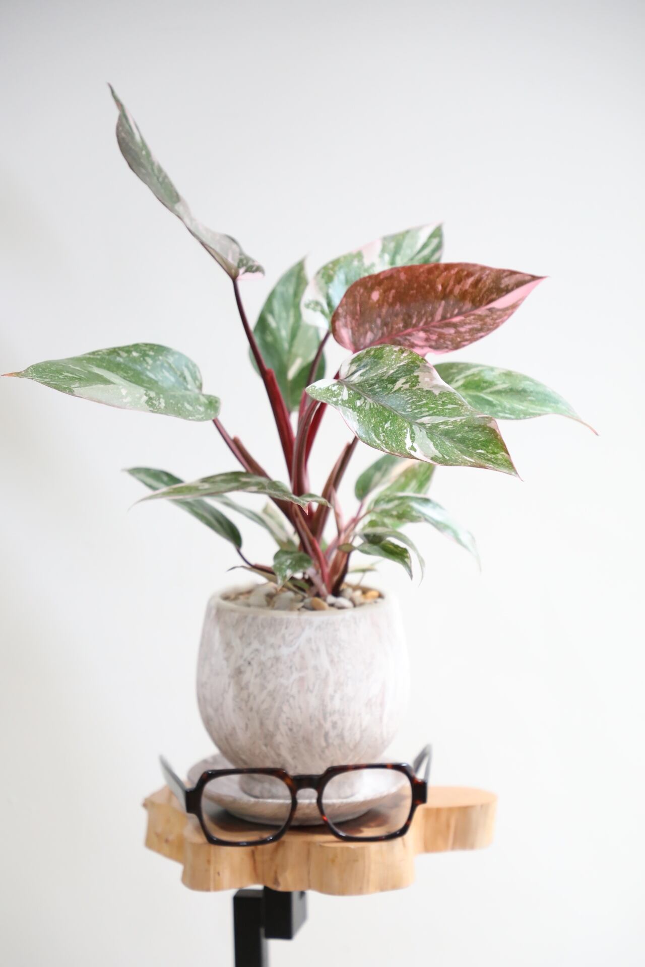 鮮やかで艶やかな葉に刻まれるピンクの斑と、茎に入るレッドとのコントラストが美しいフィロデンドロンの仲間。一枚一枚違った表情の葉柄を楽しめます。