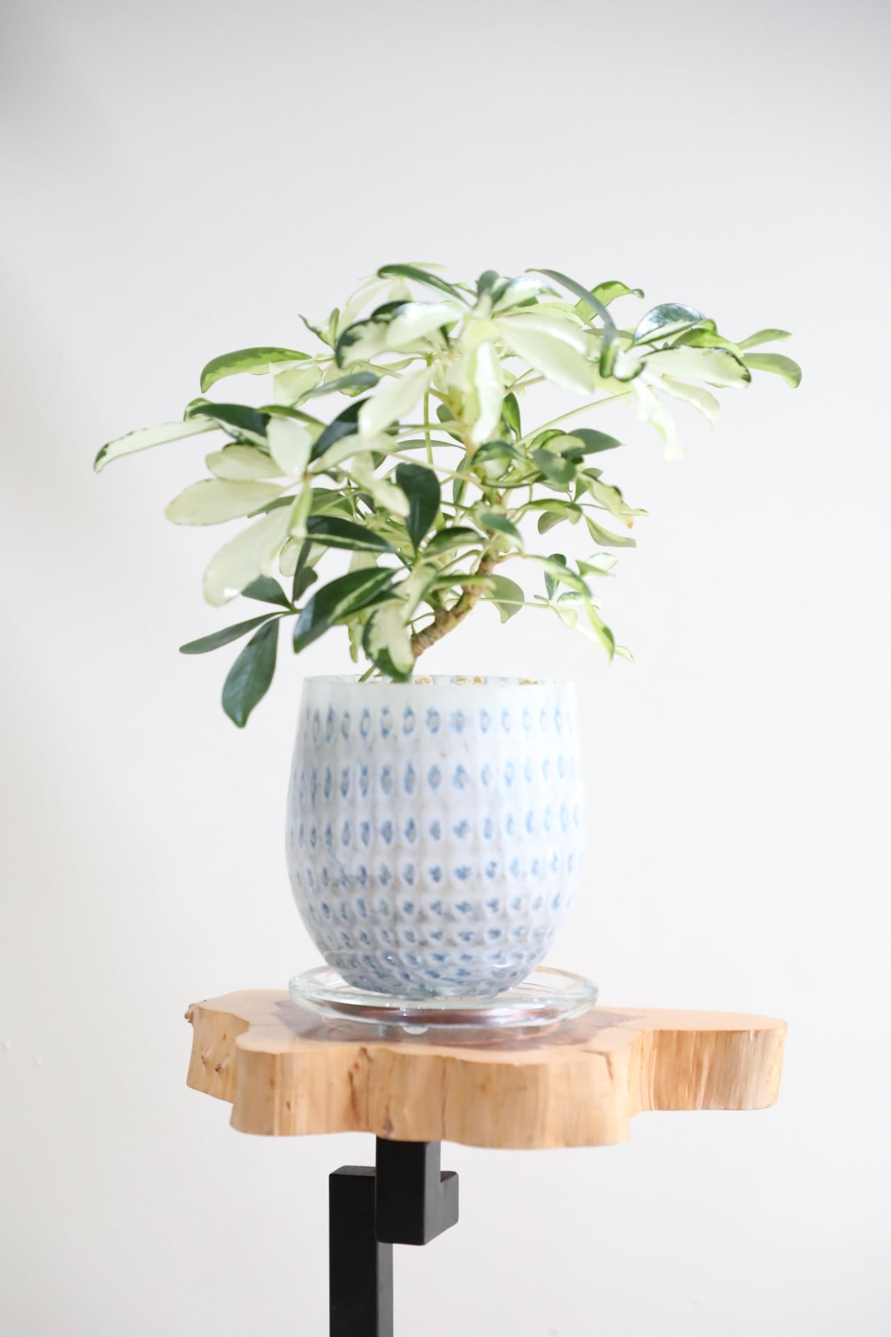 手の平をひろげたようなもっちりとした葉が可愛らしいシェフレラの、上品な斑入り品種。まろやかで繊細な葉を眺めていると自然と心が和みます。お部屋に明るさをもたらせてくれる優れものです。