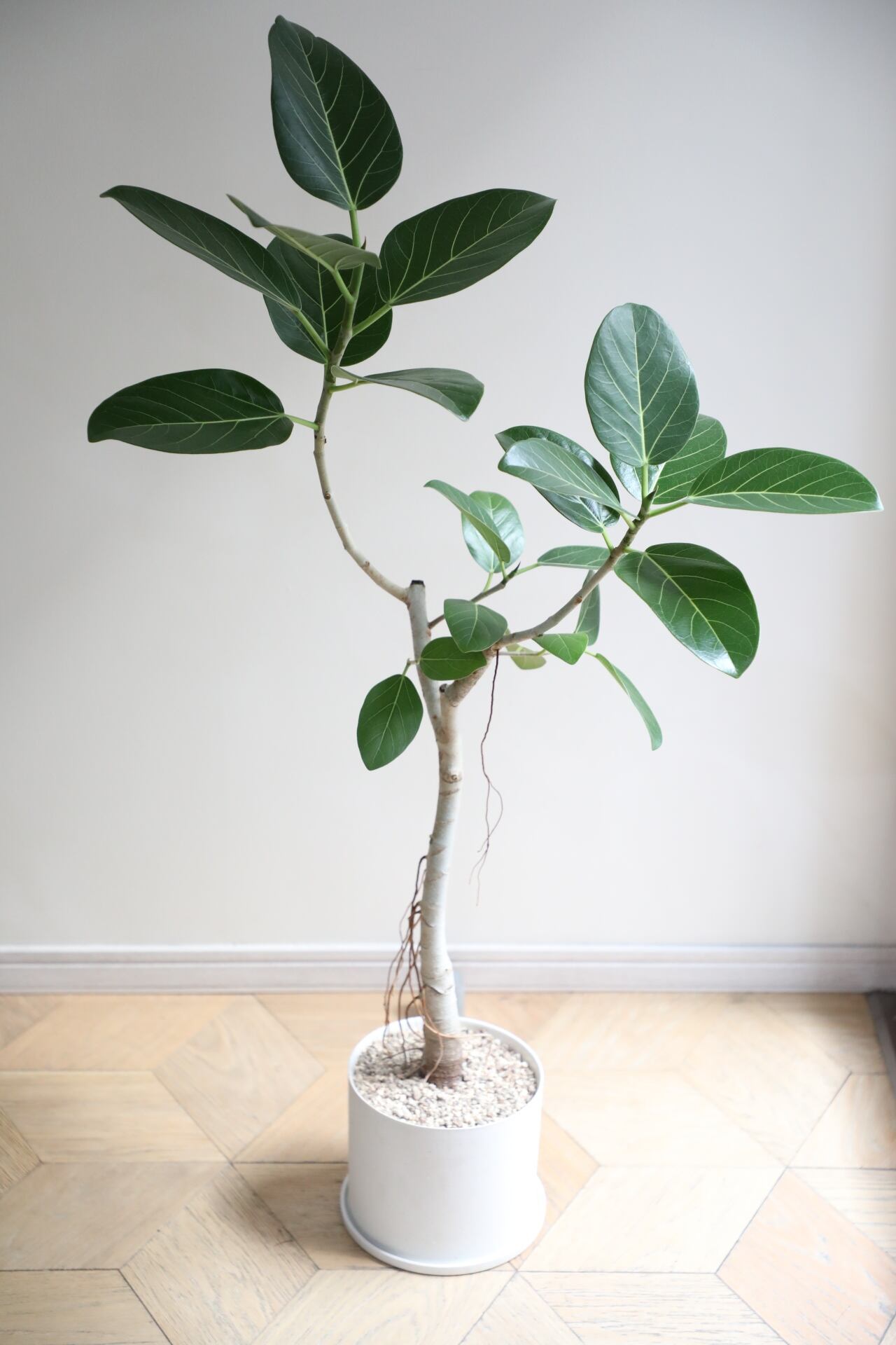 肉厚で頑丈な葉が特徴のゴムの木の仲間。人気のベンガレンシスの曲げ木仕立てです。小ぶりながら大きい葉の樹形で存在感たっぷり!しっかり日光を当ててあげるとより綺麗に発色します。