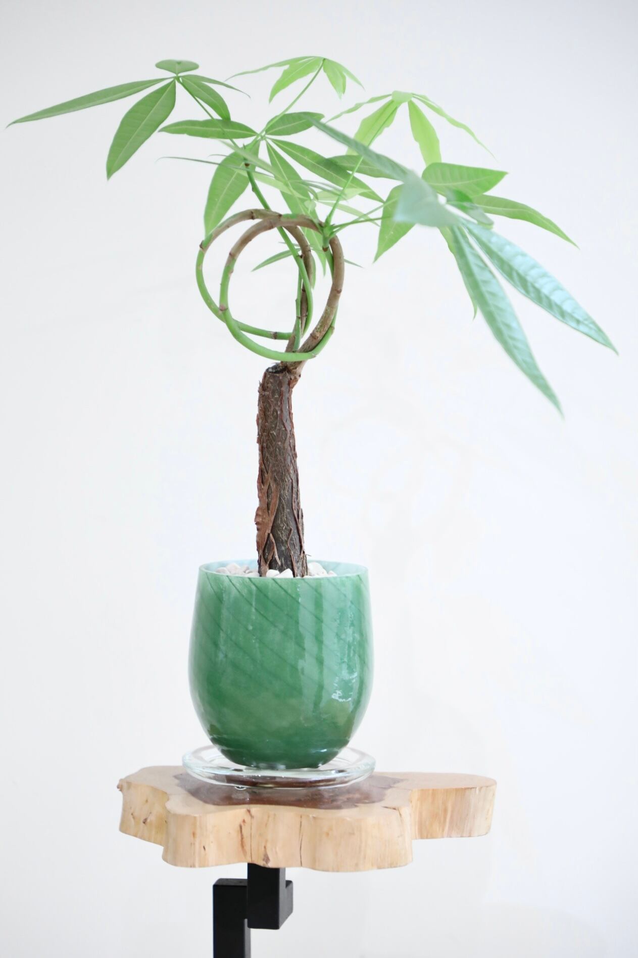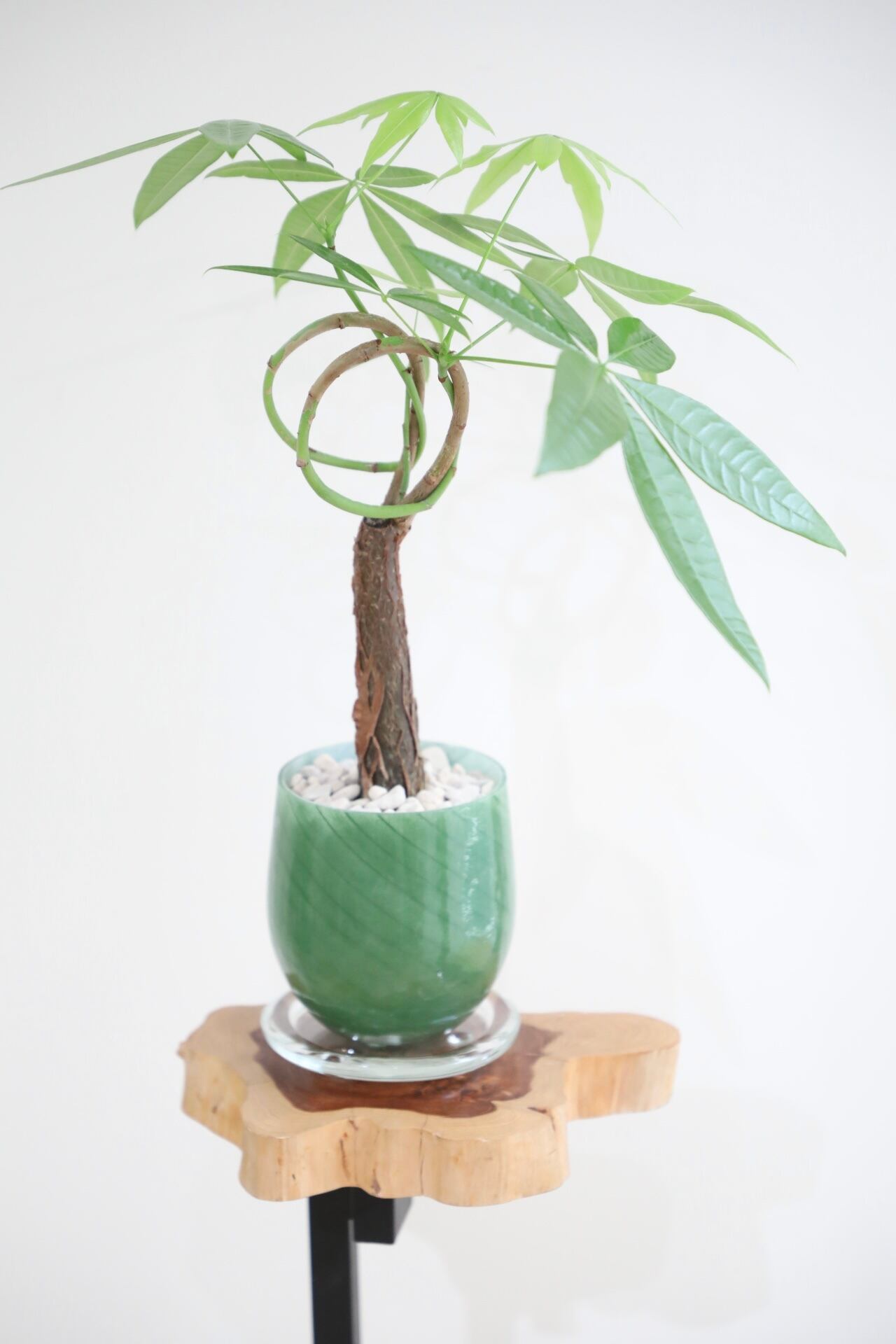 若い時期に結び目を作り育てられたユニーク且つ縁起の良い樹形です。悪い気を吸収したり、金運アップの木と呼ばれたりと、風水的にもとても人気の高いパキラ。結び仕立てでインテリア性の高い一品です。青々とした力強い葉とスッと伸びた幹は見飽きません。