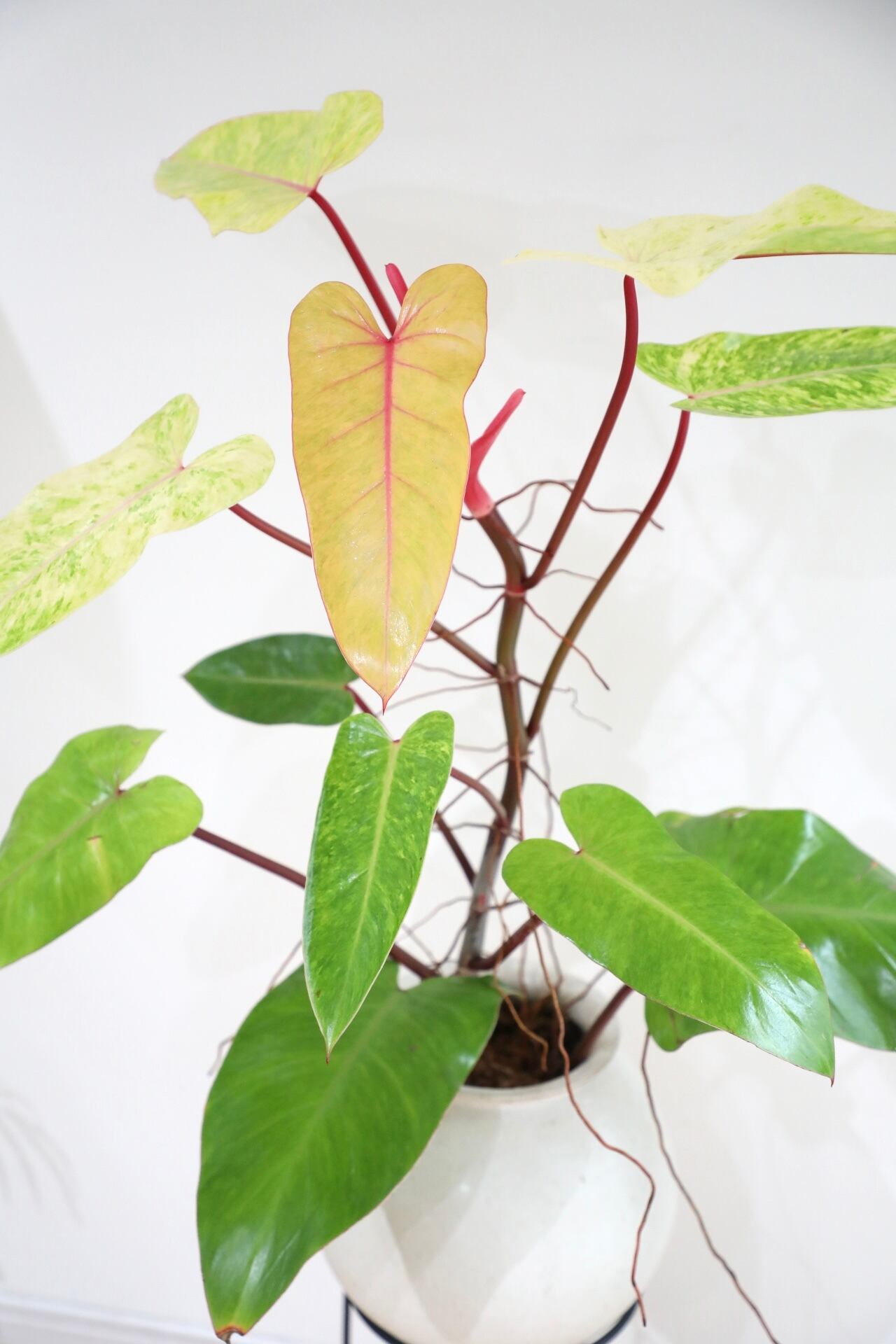 滅多にお目にかかることのないフィロデンドロンの希少種。イエロー、グリーン、レッドで織りなす独特な葉模様の存在感は格別です。一枚一枚違った表情の葉柄を楽しめます。