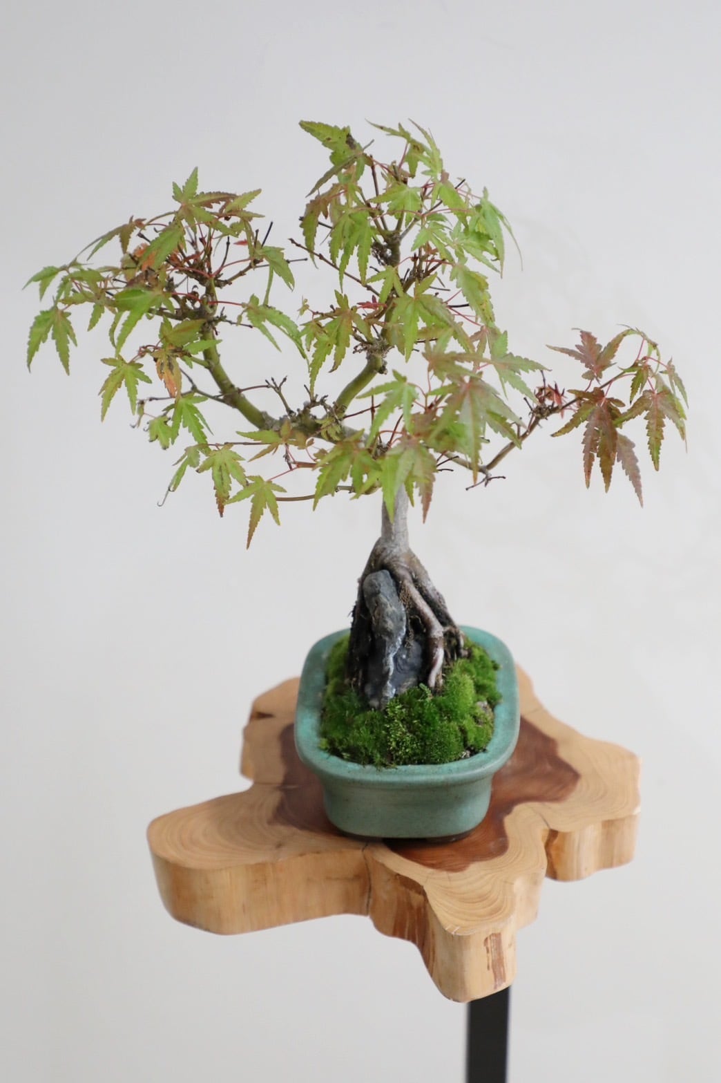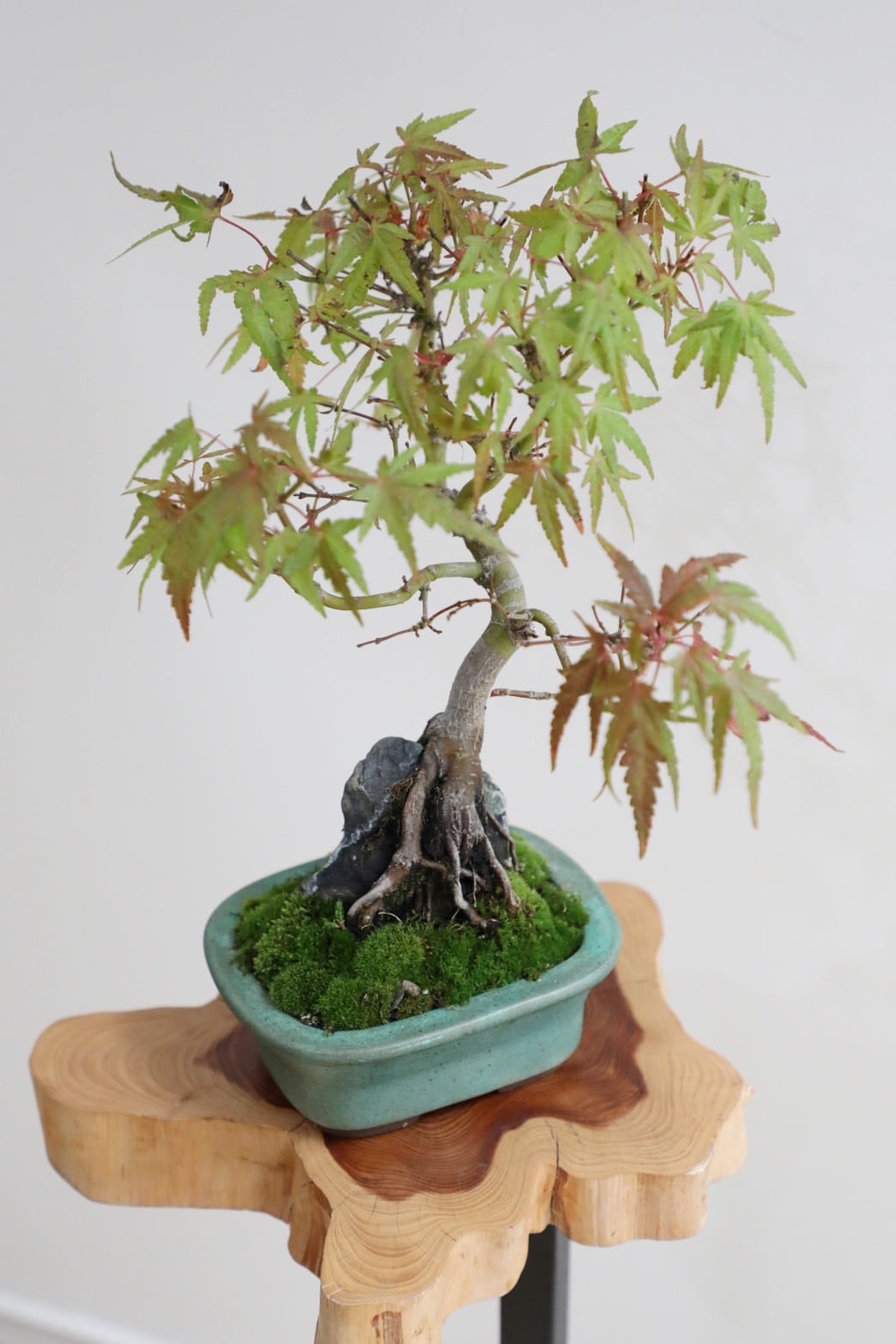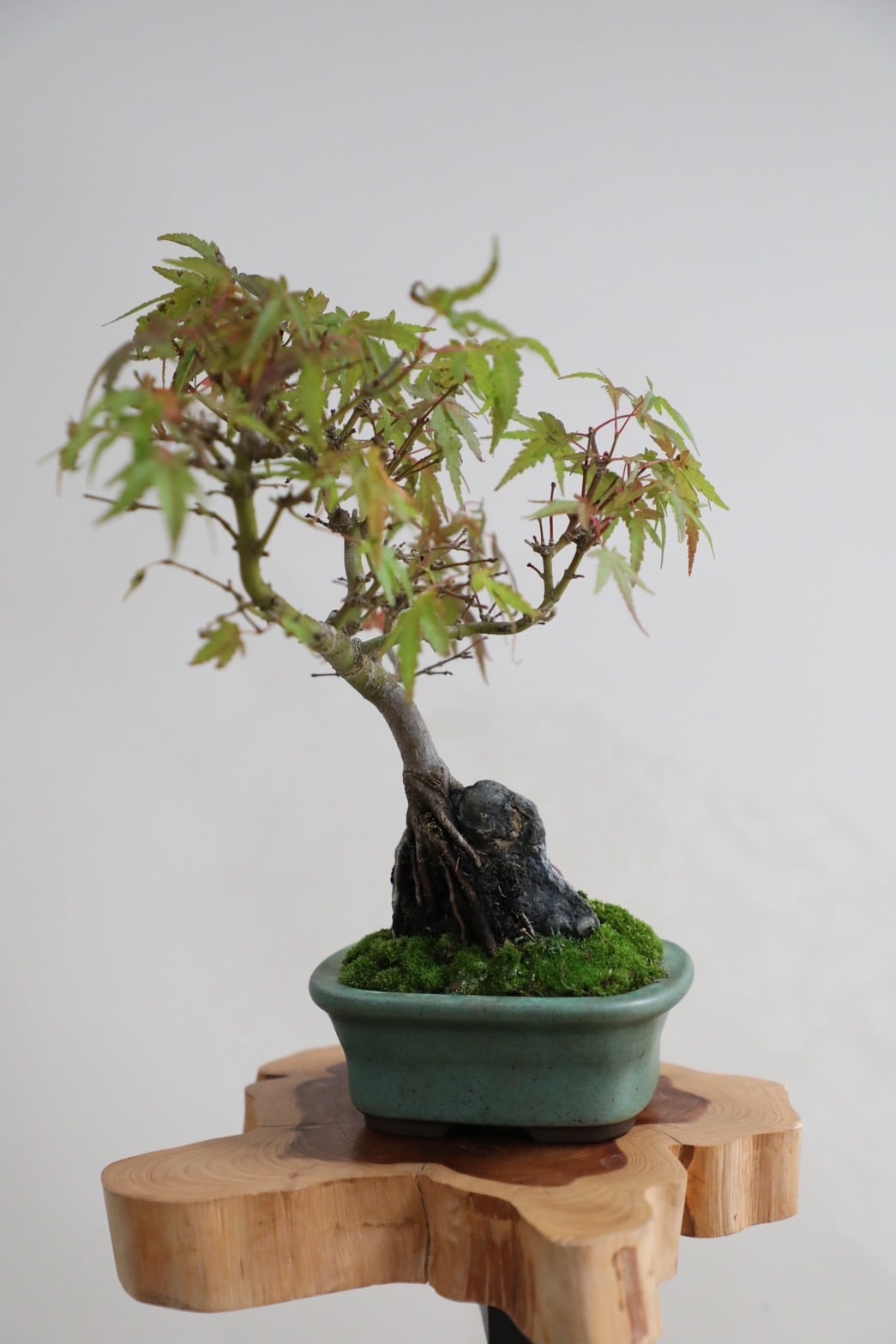 琴姫モミジは、石付きで育てるのが難しいといわれており、盆栽職人さんの熟練した技により長年かけて着生した石付き盆栽です。
