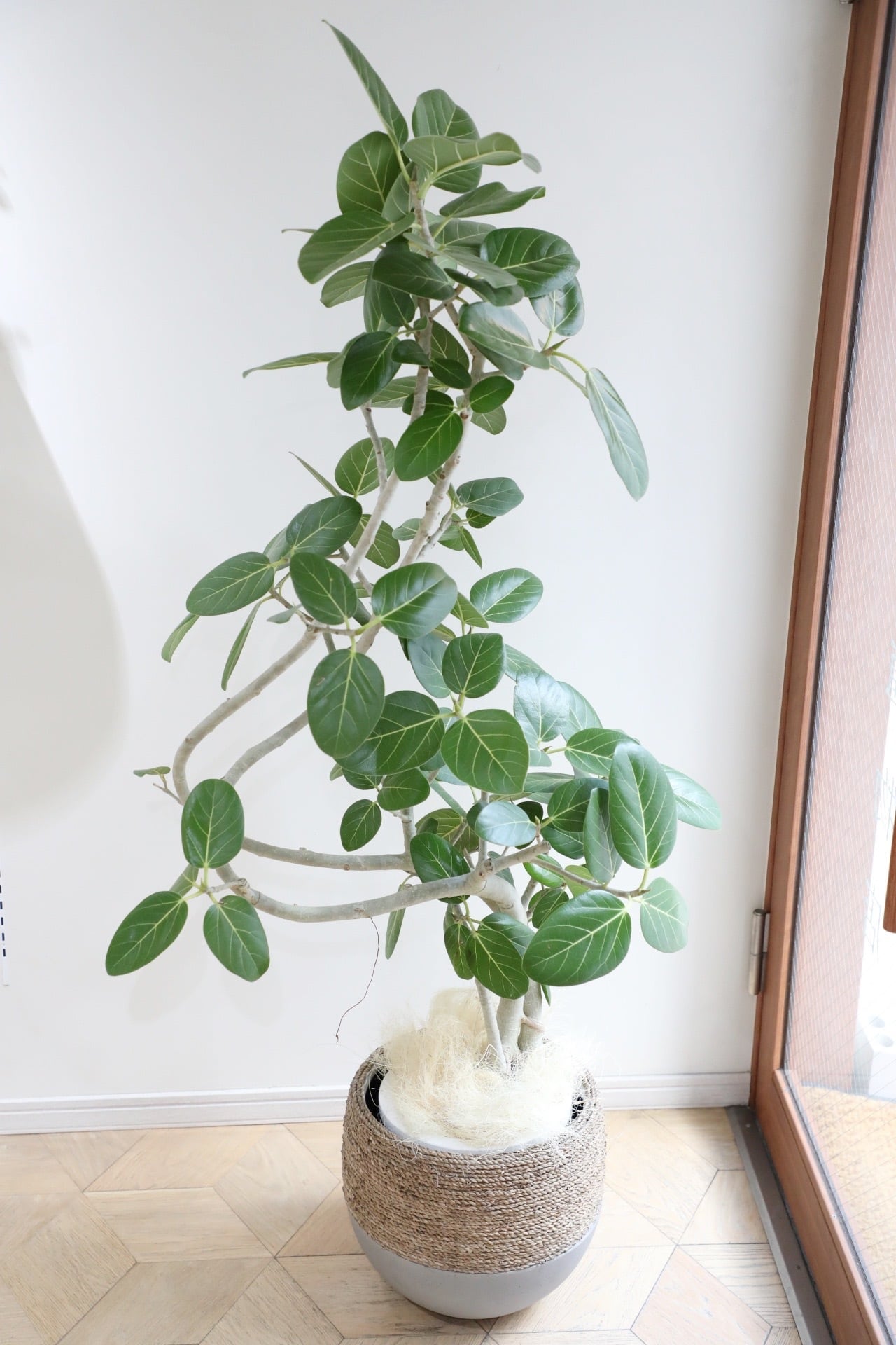 肉厚で頑丈な葉が特徴のゴムの木の仲間。人気のベンガレンシスの曲げ木仕立てです。逞しい幹と生命力溢れる青々とした葉に魅了されます。しっかり日光を当ててあげるとより綺麗に発色します。
