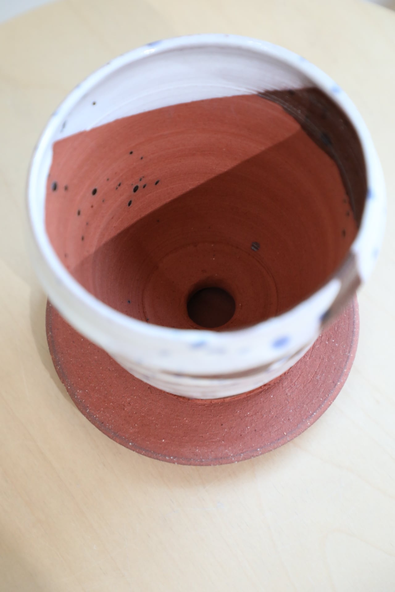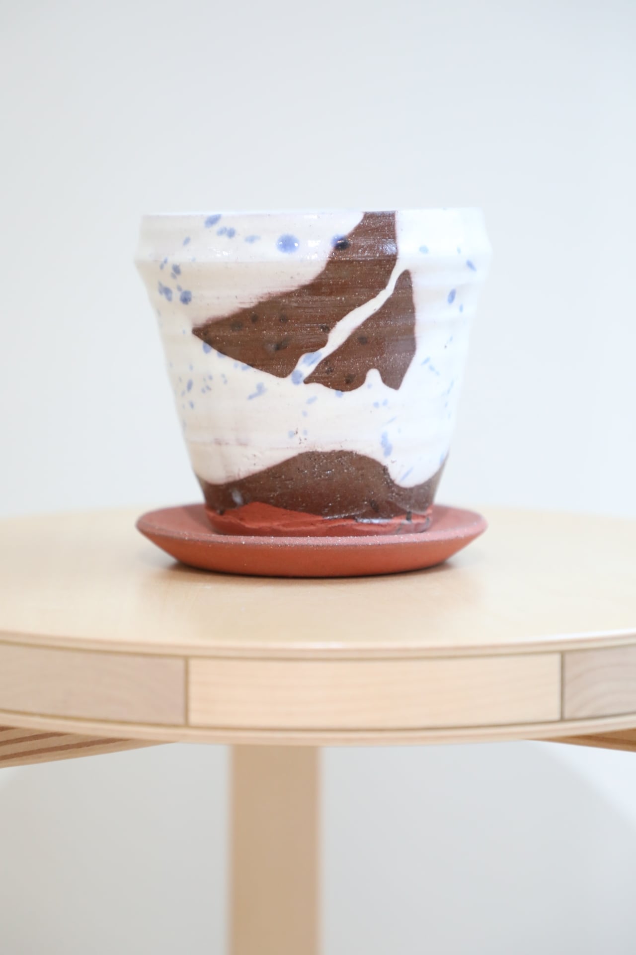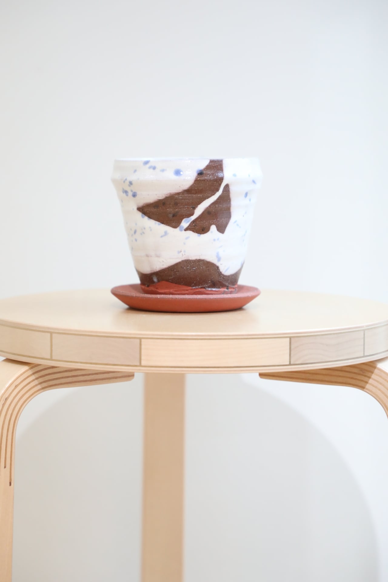 赤土をベースに、白化粧と淡い藍色の釉薬を重ねることで、土の質感と柔らかな筆跡が調和したデザインが魅力。滋賀県で古くから伝わる信楽焼で製作された一品。