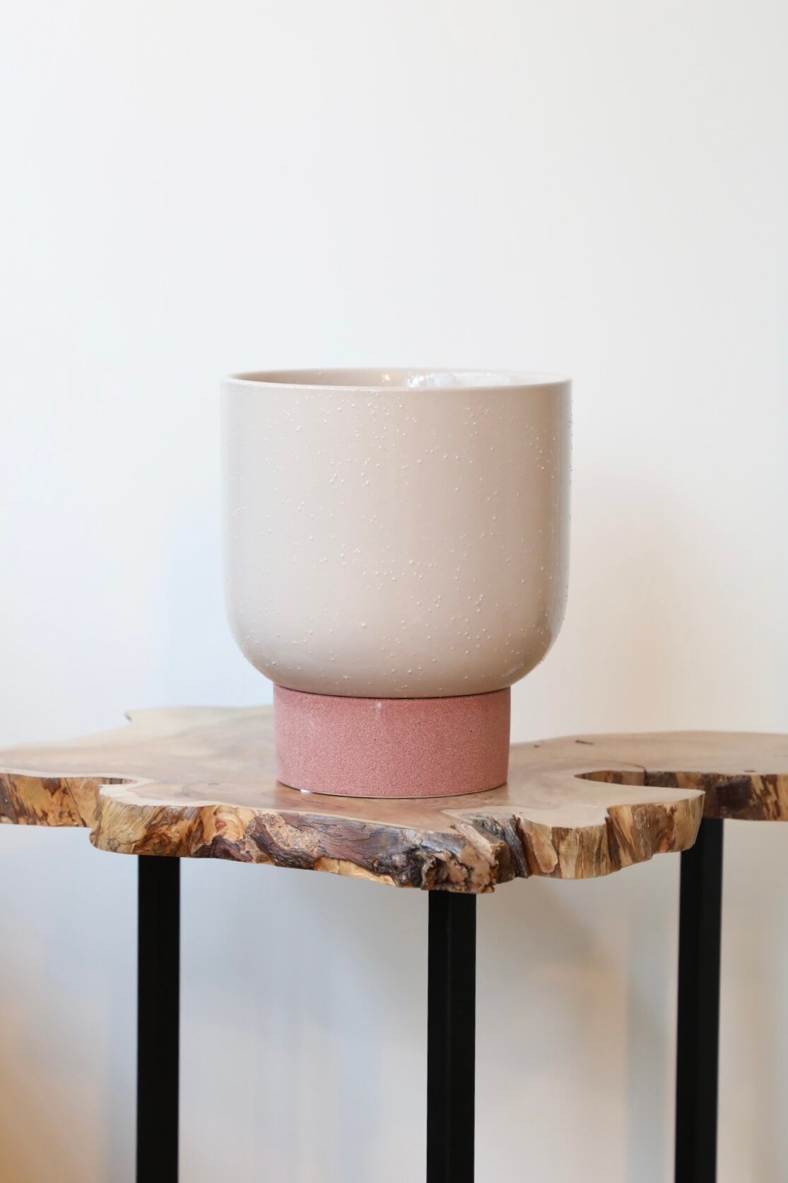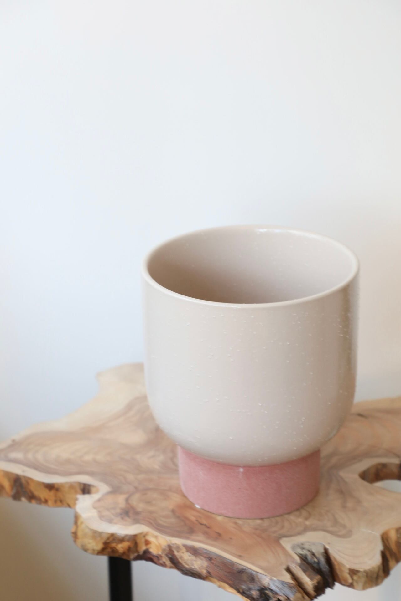 アンティークかつモダンなデザインが魅力的。 どのようなインテリアにも合い、コーディネートしやすい鉢カバーです。 直径16cm×高さ18.5cm 口内寸14.5cm 深さ15cm 素材:セラミック ※底穴あり、受け皿あり ※底穴がありますので直接植え込みも可能です。