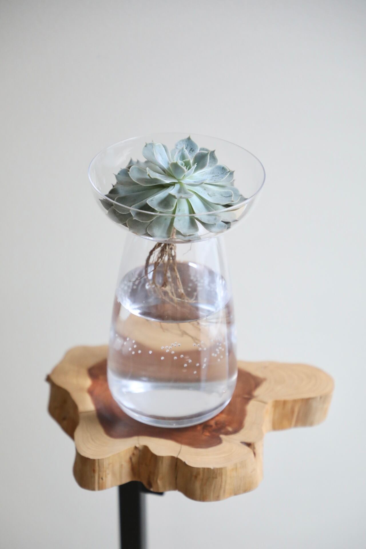 花びらのような樹形が美しいエケベリア。プリッとした可愛らしい樹形から伸びる花のシルエットは毎日でも見飽きることはありません。土を使わず水だけで育てるハイドロプランツです。